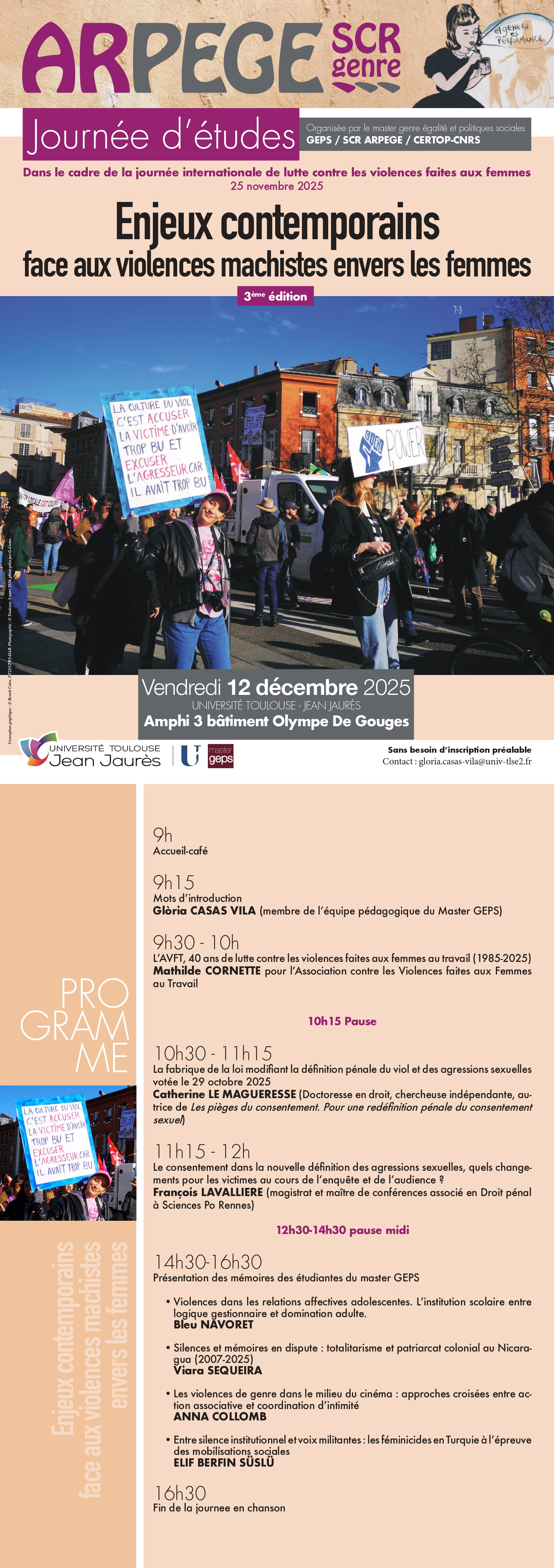 12 décembre >2025 (9h-16h) : Troisième édition de la journée d'études sur les enjeux contemporains face aux violences machistes envers les femmes, Amphi 3 bâtiment Olympe de Gouges, Université Toulouse II Jean Jaurès